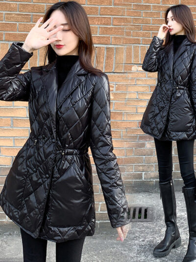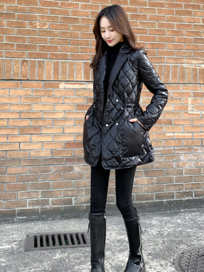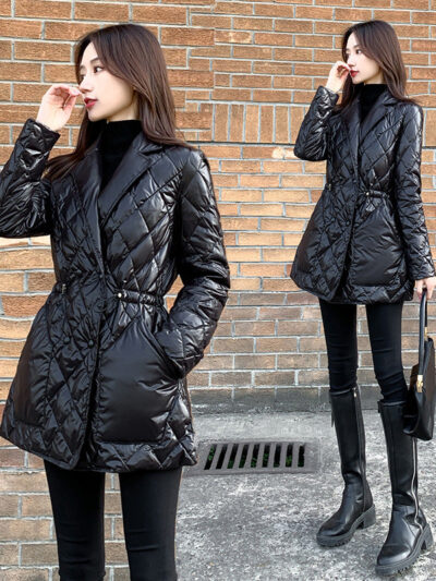 Winter slim waist mid-length imitation down jacket women shiny black suit collar cotton jacket