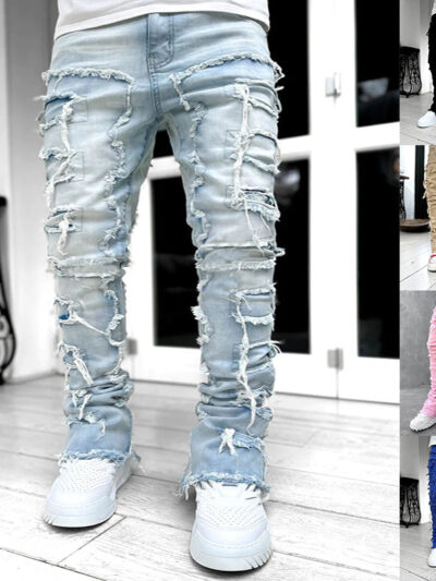 Men Trousers Individual Patched Pants Long Tight Fit Stacked Jeans For Mens Clothing