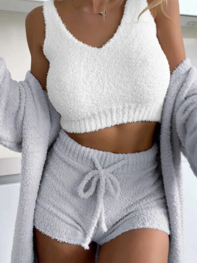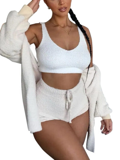 Thermal Three-piece Fluff Coat Spaghetti Strap Short Top Shorts Suit